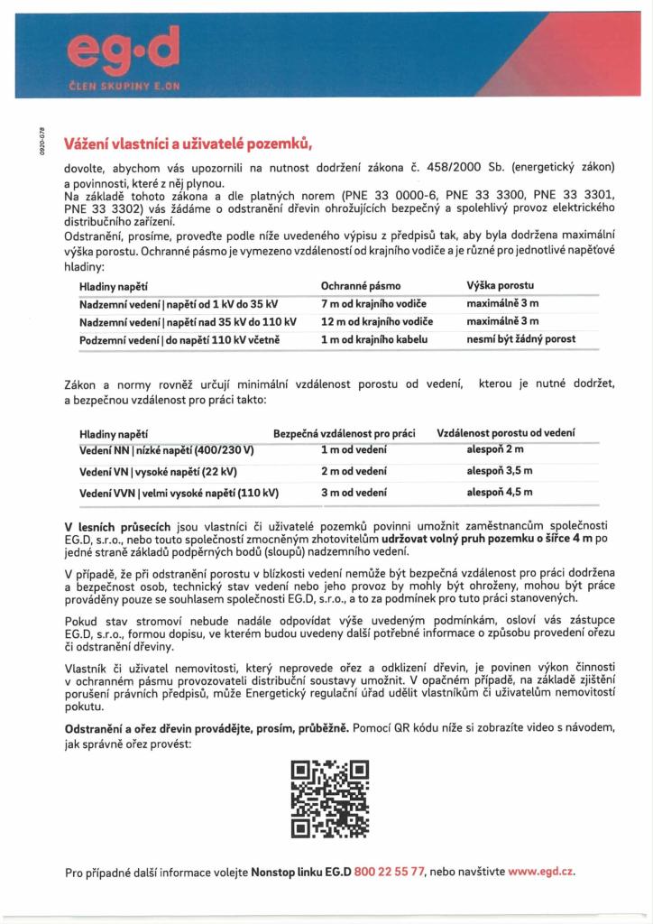 Firma EG.D, a. s. upozorňuje vlastníky a uživatele pozemků na zákonnou povinnost odstranění dřevin ohrožujících bezpečný a spolehlivý provoz elektrického distribučního zařízení. Více informací naleznete po rozkliknutí
